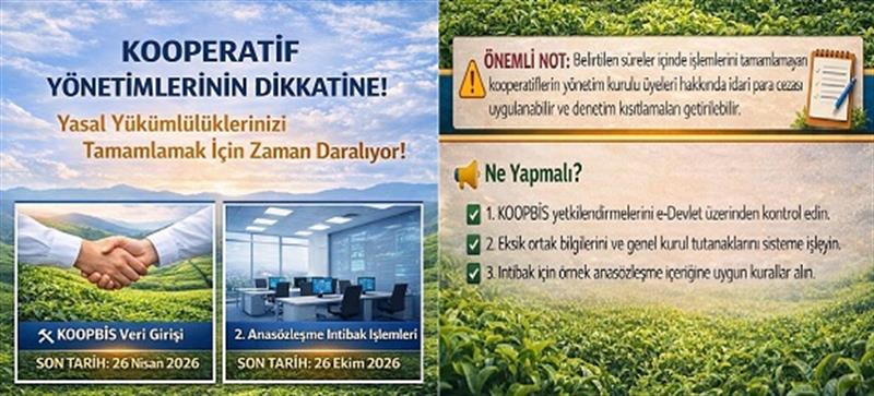 1163 Sayılı Kooperatifler Kanunu kapsamında KOOPBiS'e veri girişleri için son tarih 26 Nisan 2026'dır.
